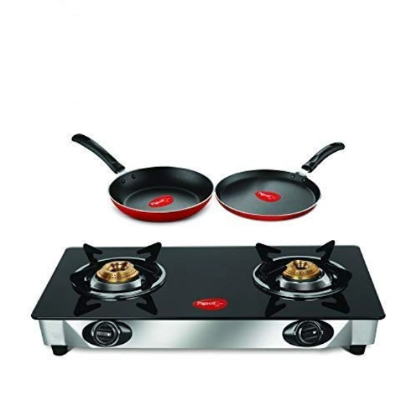 - Package Contents: 1 - Pigeon Ayush 2 Burner Gas Stove (Manual) + Favourite Duo pack (Flat tawa 240 + Fry pan 250)