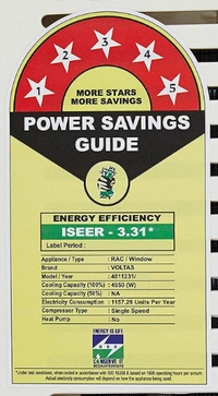 - Energy Rating: 5 Star. Best in class efficiency. Annual Energy Consumption: 1157.29 units. ISEER Value: 3.31 (Please refer energy label on product page or contact brand for more details)